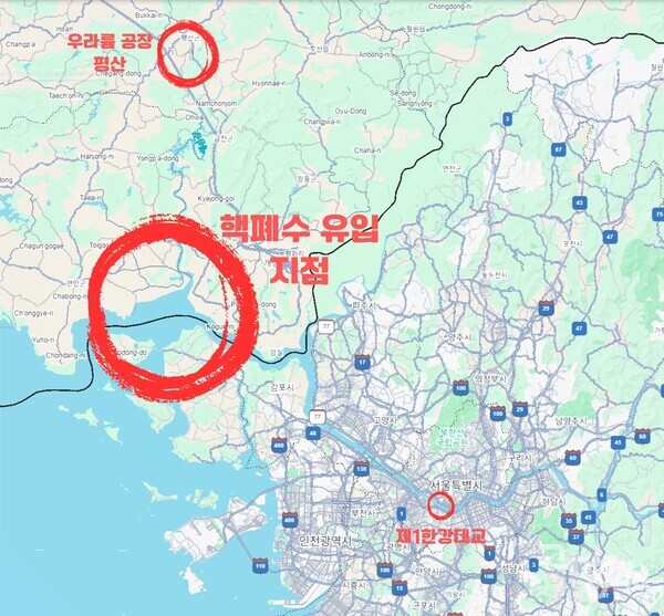 이번 논란의 시작은 미국의 한 북한 전문 매체가 공개한 위성사진 한 장이었습니다. 사진에는 평산 우라늄 공장 인근의 침전지(폐기물을 가라앉혀 모아두는 곳)에서 나온 검은 폐수가 배수로를 통해 예성강으로 흘러 들어가는 모습이 포착되었습니다. 이 예성강은 남쪽으로 흘러 한강 하구와 만나 우리 서해로 이어집니다.