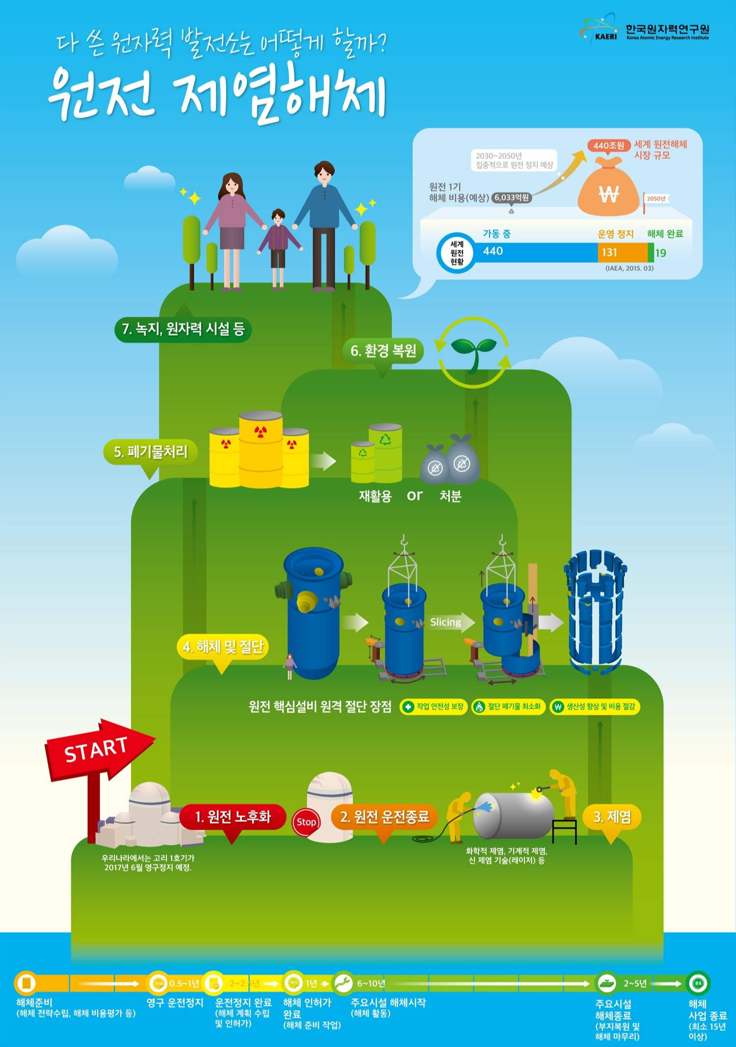 원전 해체는 크게 3단계로 나뉩니다. 1단계는 '제염 및 해체'입니다. 방사성 물질에 오염된 설비와 구조물을 화학약품 등으로 닦아내 오염도를 낮추고(제염), 이후 원격 로봇이나 전문 인력이 투입되어 원자로를 포함한 각종 구조물을 절단하고 철거(해체)합니다. 2단계는 '폐기물 처리 및 처분'입니다. 해체 과정에서 나온 방사성 폐기물들을 방사능 준위에 따라 분류하여 경주에 있는 중·저준위 방폐장으로 보내거나, 고준위 폐기물은 별도의 장소에 안전하게 관리해야 합니다. 마지막 3단계는 '부지 복원'입니다. 모든 구조물이 철거되고 부지의 방사능 수치가 자연상태와 같아지면, 해당 부지를 다른 용도로 사용할 수 있도록 되돌리는 것입니다.